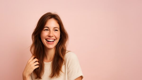 Stralend jong stel dat samen poseert tegen een zachte beige achtergrond. De vrouw met golvend blond haar en spijkerjack raakt haar haar aan, terwijl de man met donker krullend haar en een getrimde baard een lichtgrijs T-shirt draagt. Beiden lachen ontspannen en tonen gezond haar.